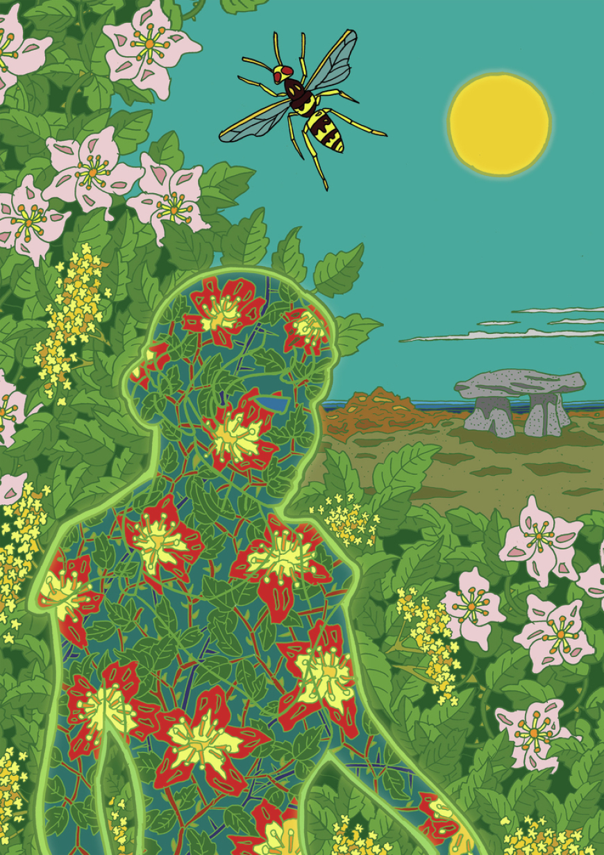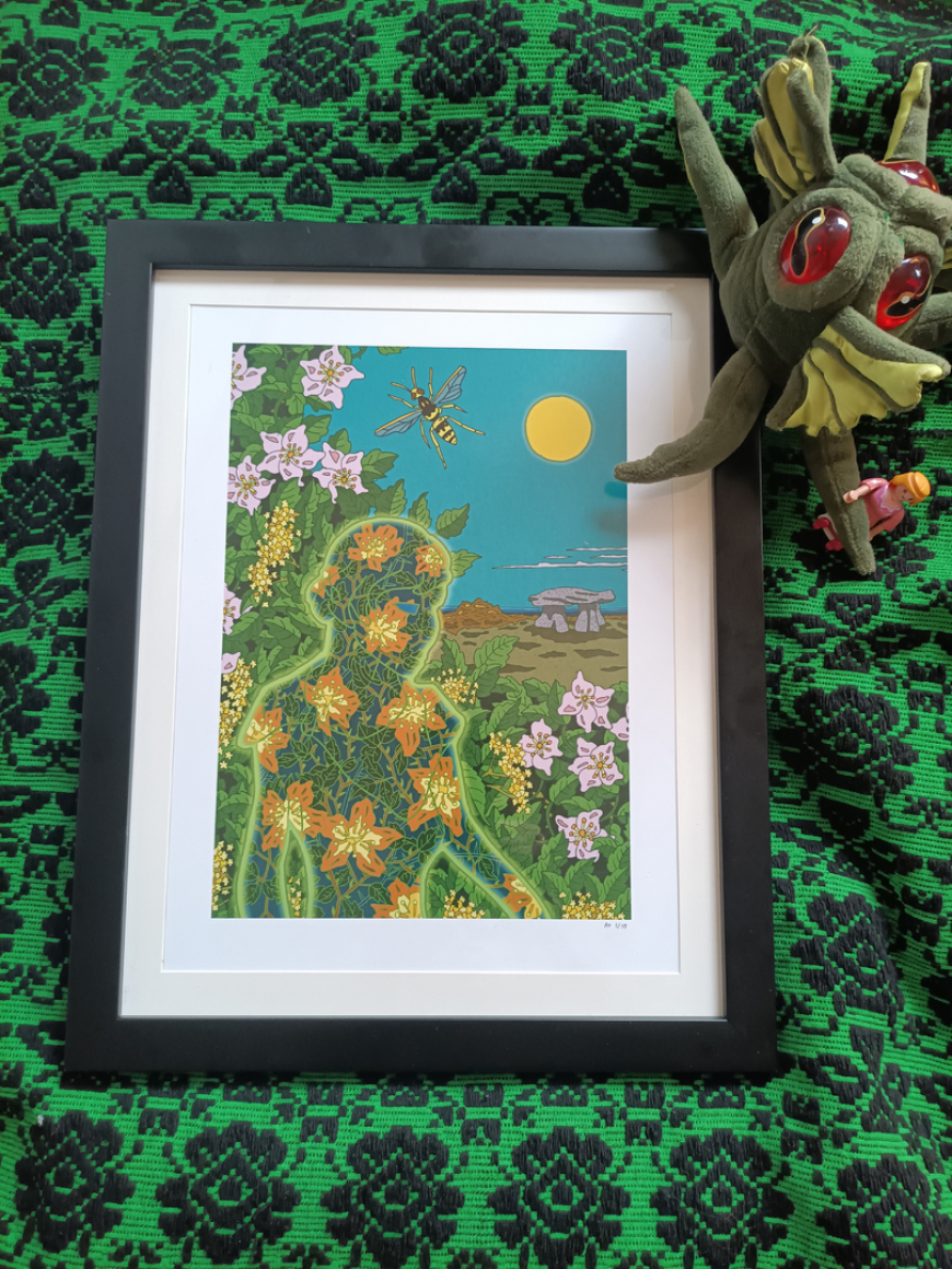 I have designed a print based on the fantastic book 'The Course of the Heart' by M. John Harrison. The odd flower maiden from the Coeur / Pleroma is here pictured in front of Morvah , Cornwall, as she is in this most magical of weird fiction books.